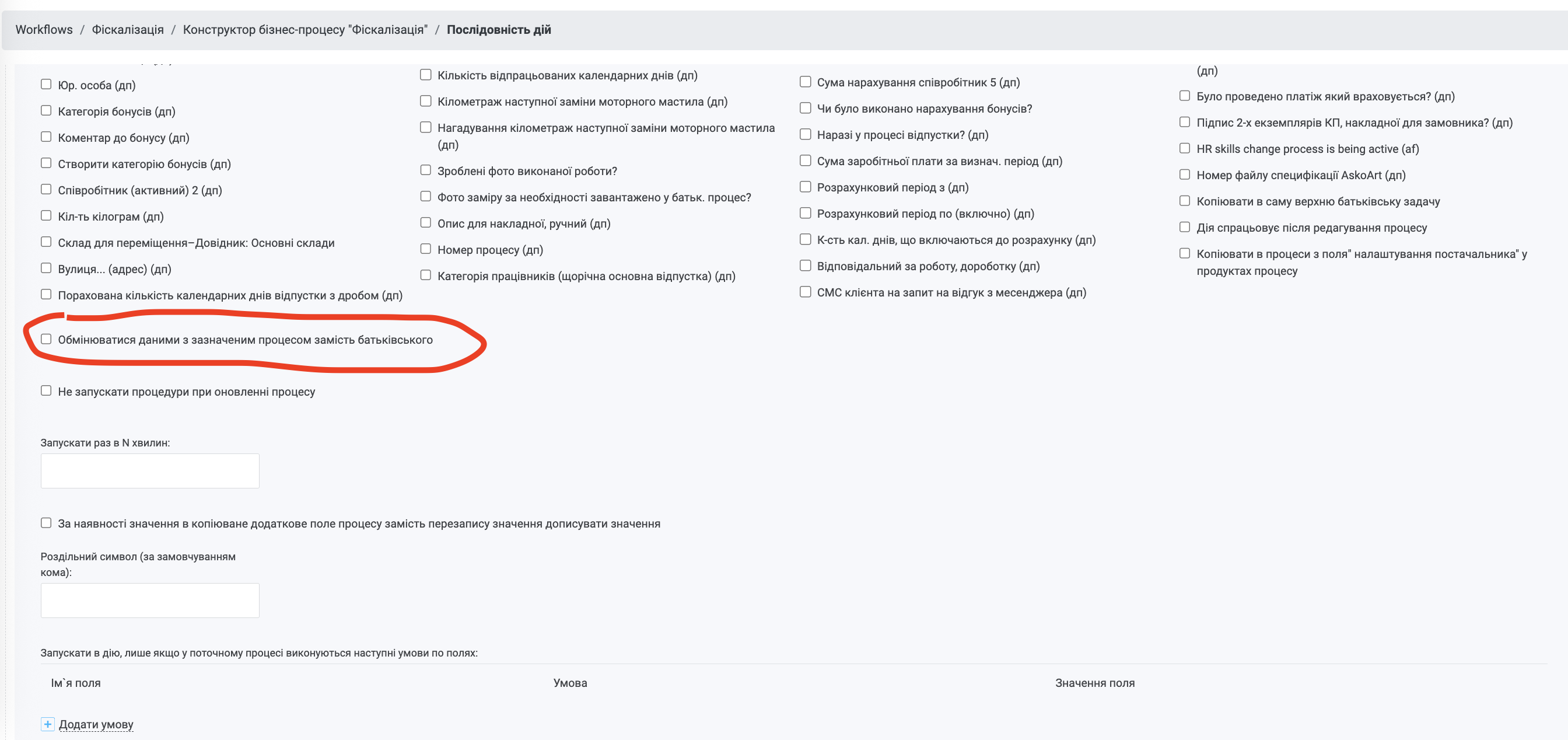 Polupan Serhiy Polupan wrote: Yes, I mean a good algorithm, but in principle you already have it implemented. That is: There is an action "Copy field value to parent process or specified process" This action has an option (shown in the screenshot) "Exchange data with the specified process instead of the parent" Do this, similar to the action - "Copy field value from parent process"