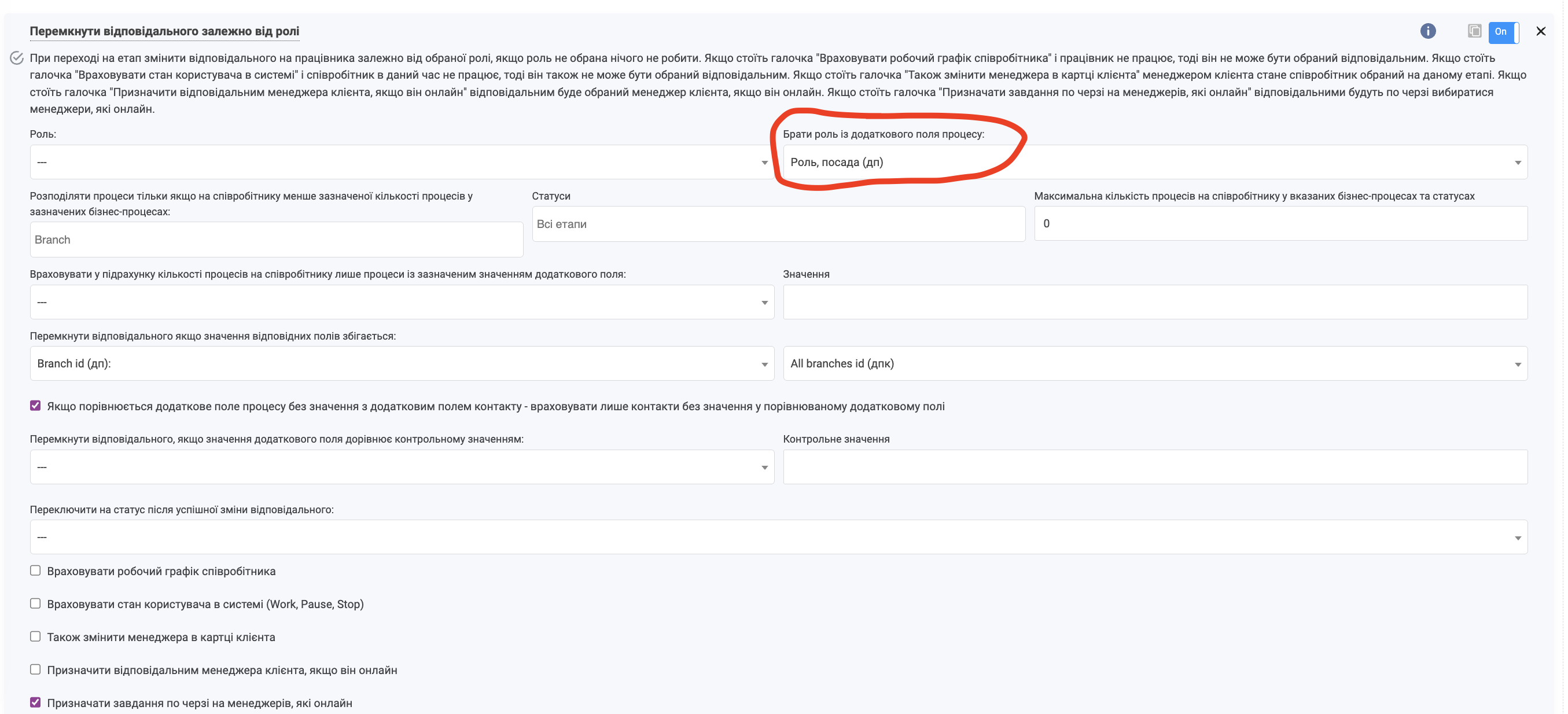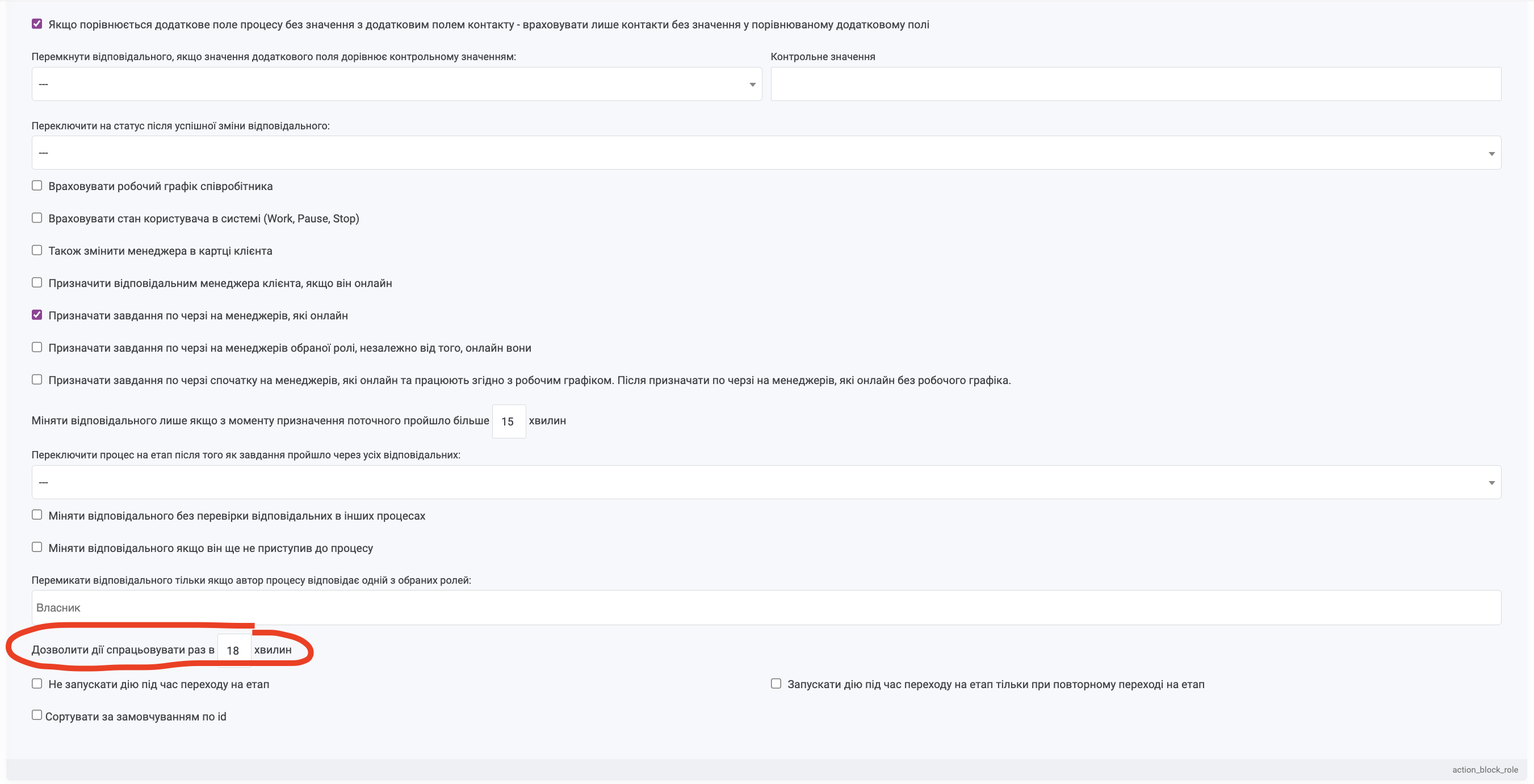 2 - in the action "Switch responsible depending on role" add an option to specify the range of action activation so as not to load the system during non-working hours (indicated in the screenshot)