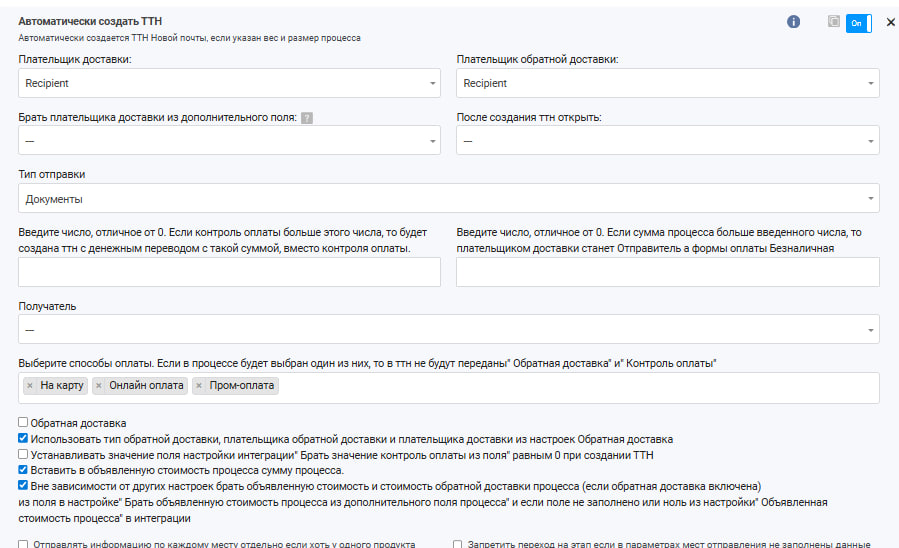 Приветствую. Почему при автоматическом создании ТТН и способе оплаты не равен Оплата при получении, плательщиком за доставку становится отправитель. Мне нужно чтобы был плательщик Получатель