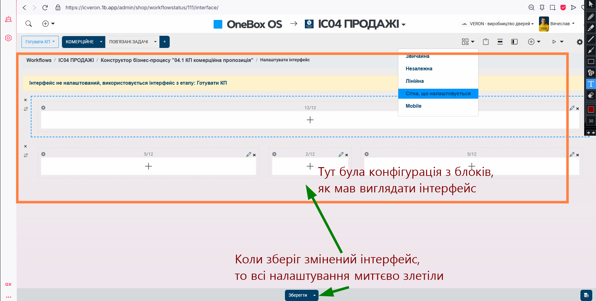 ТУТ /admin/shop/workflowstatus/111/interface/ взагалі злетів інтерфейс на блоках Сітка що налаштовується при спробі його змінити.
