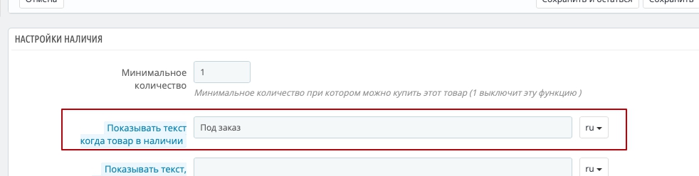 То текст має бути завжди "В наявності" 2. Якщо товару немає в наявності згідно з цим самим налаштуванням, то значення тексту має братися з додаткового поля продукту